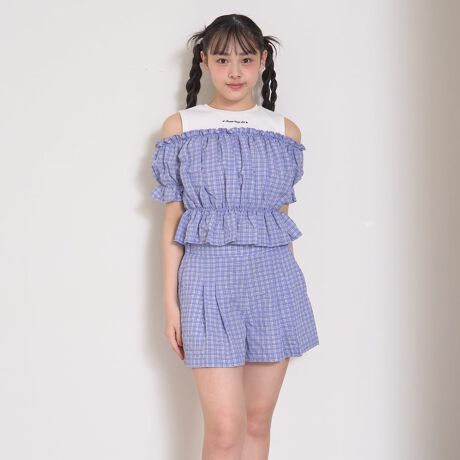 テレコのタンクトップとチェック柄のオフショルブラウスをドッキングしたトップスに、シンプルなタックキュロットを合わせたセットアップ商品。