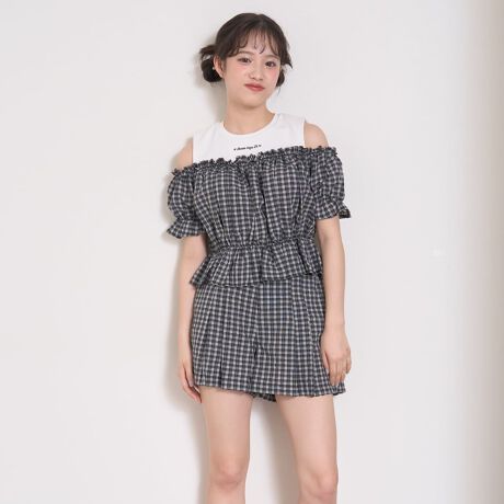 テレコのタンクトップとチェック柄のオフショルブラウスをドッキングしたトップスに、シンプルなタックキュロットを合わせたセットアップ商品。