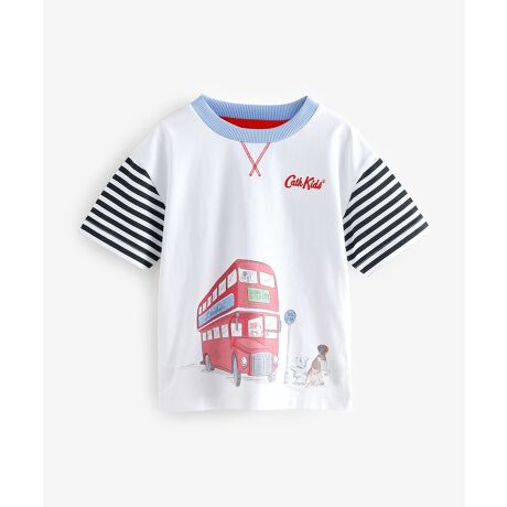 元気いっぱいで遊び心あふれるデザインのCath KidstonのキッズTシャツ。お子さまのカジュアルなワードローブを明るく彩る、スタイルと着心地の良さを兼ね備えた一枚です。清潔感のあるホワイトのボディをベースに、ネイビーのボーダー袖と、赤いVステッチの装飾が映えるブルーのネックラインが絶妙なコントラストを描きます。