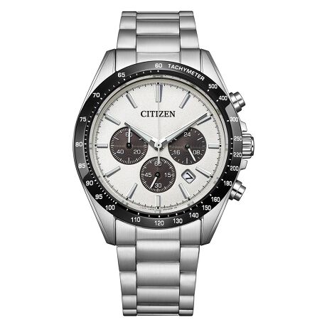 スポーティで洗練されたルックスのスタンダードなエコ・ドライブ クロノグラフモデル。ラグを太く短く、ベゼルをワイドに設計し、タキメーターの数値表記を横書きにすることで、スポーティさを引き立てました。光沢のある発色の良い金属文字板を採用。デザインのアクセントでもある3つのサブダイヤル部分が光を取り込み、電気エネルギーへと変換する仕様です。暗い場所でも時刻を読み取りやすい夜光付きの時分針とインデックスや、視認性を高めるために広めに設けられた日付表示の開口部など、快適な使用感を追求しました。