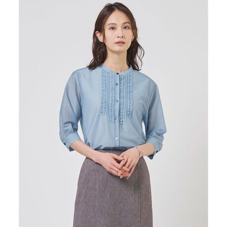 ■デザイン繊細なフリルとピンタックを組み合わせた、バンドカラーシャツライクカットソー。甘さを抑えたフリルディテールを、シャープなピンタックとシアーなストライプ生地と合わせることで、洗練された印象に仕上げました。釦を閉じて1枚で着るのはもちろん、前を開ければ軽やかな羽織りとしても活躍。シワになりにくく持ち運びもしやすいため、旅行や出張などのシーンにも最適です。デニムと合わせてカジュアルダウンしたり、きれいめなパンツと合わせてオフィススタイルにしたりと、幅広いコーディネートをお楽しみいただけます。カラーは、軽やかな印象のオフベース(#101)、女性らしさを引き立てるピンクベース(#112)、知的で爽やかなサックスベース(#173)の3色展開です。
