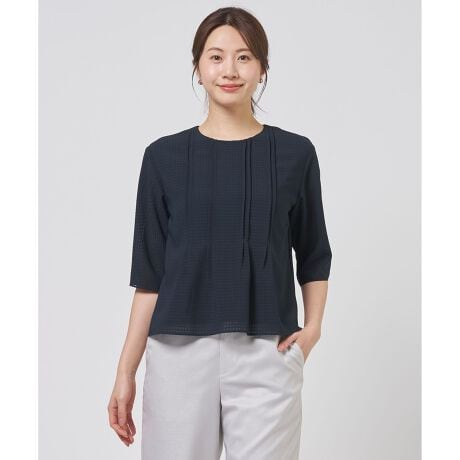 シアー感のあるカットソー生地と薄手ジャージを前身頃で重ねた、軽やかで涼しげなプルオーバー。透け感を抑えつつも春らしい爽やかな印象に仕上げました。前身頃の途中まで施したピンタックが縦のラインを強調し、すっきりとしたシルエットにさりげない華やかさをプラス。袖は1枚仕立てで、素材のシアー感を活かした軽快なデザインに。1枚で着映えし、きれいめからカジュアルまで幅広く活躍するアイテムです。カラーは、上品で落ち着いた印象のスレート(#004)、シックなネイビー(#075)の2色展開です。