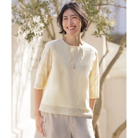 ■デザイン裾と袖にオリジナルの刺繍生地をあしらい、華やかなアクセントを加えたカットソー。今年は複数のモチーフを組み合わせたボーダー柄の刺繍を採用し、繊細かつ表情豊かな仕上がりにこだわりました。身頃には伸縮性のあるジャージ素材を使用しているため、動きやすく快適な着心地を叶えます。ブラウスのようなきちんと感がありながらも、Tシャツ感覚で気負わず着られるのが魅力です。カラーは、清潔感のあるホワイト(#001)、上品で落ち着いた印象のグレージュ(#003)、差し色になるイエロー(#042)、爽やかな印象のサックス(#073)の4色展開です。