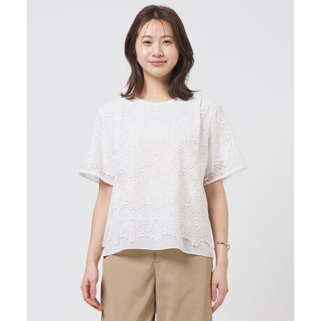 ■デザイン大柄レースを使用した、華やかな印象のカットソー。内側にジャージ素材を重ねているため、透け感やインナー選びに迷うことなく、1枚で安心してご着用いただけます。裾部分はレースの柄を活かした波型のスカラップデザインで仕上げ、エレガントな雰囲気を演出。さらに、裾からシアーな別布がさりげなくのぞくようにデザインし、涼しげで軽やかな抜け感をプラスしています。ジャケットのインナーとしても華やかさをプラスしてくれるため、オフィスシーンやちょっとしたお食事会にもおすすめです。カラーは、清潔感のあるホワイト(#001)、上品で落ち着いた印象のグレージュ(#003)、爽やかな上品さのあるグレイッシュブルー(#072)の3色展開です。