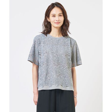 ■デザイン大柄レースを使用した、華やかな印象のカットソー。内側にジャージ素材を重ねているため、透け感やインナー選びに迷うことなく、1枚で安心してご着用いただけます。裾部分はレースの柄を活かした波型のスカラップデザインで仕上げ、エレガントな雰囲気を演出。さらに、裾からシアーな別布がさりげなくのぞくようにデザインし、涼しげで軽やかな抜け感をプラスしています。ジャケットのインナーとしても華やかさをプラスしてくれるため、オフィスシーンやちょっとしたお食事会にもおすすめです。カラーは、清潔感のあるホワイト(#001)、上品で落ち着いた印象のグレージュ(#003)、爽やかな上品さのあるグレイッシュブルー(#072)の3色展開です。
