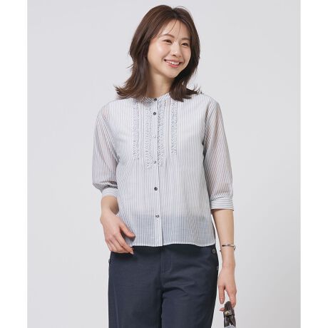 ■デザイン繊細なフリルとピンタックを組み合わせた、バンドカラーシャツライクカットソー。甘さを抑えたフリルディテールを、シャープなピンタックとシアーなストライプ生地と合わせることで、洗練された印象に仕上げました。釦を閉じて1枚で着るのはもちろん、前を開ければ軽やかな羽織りとしても活躍。シワになりにくく持ち運びもしやすいため、旅行や出張などのシーンにも最適です。デニムと合わせてカジュアルダウンしたり、きれいめなパンツと合わせてオフィススタイルにしたりと、幅広いコーディネートをお楽しみいただけます。カラーは、軽やかな印象のオフベース(#101)、女性らしさを引き立てるピンクベース(#112)、知的で爽やかなサックスベース(#173)の3色展開です。
