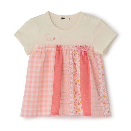 小花やチェック、ドット・・・切り替え風のプリントとギンガムを使ったAラインシルエットのチュニック。