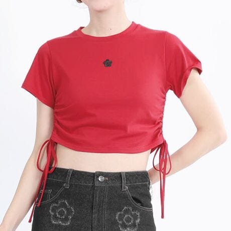 ギャザーデザインがウエストの細見えを叶えるTシャツ。◆ポイント・FRONTにデイジー刺繍・両脇の紐でお好みの丈に調節できる仕様・クロップド丈・半袖◆コーディネートハイウエストのパンツと好相性の一枚です。[型番:226-611908]