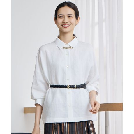日差しも暑さもやさしく和らぐリネンシャツ■デザインゆったりとした身幅で、リラックス感のある着心地が魅力のリネンシャツです。身幅を広めにすることで、夏の日差しをやわらかく遮り、軽い羽織りとしても活躍します。ドルマンスリーブからカフスにかけては、着用しやすいよう袖幅を程よく整え、バランスの取れたシルエットに仕上げています。カフスを折り返して肘下で着用するアレンジも可能で、長い夏シーズンを通して活躍する一着です。また、カリグラフィ作家とのコラボレーションアイテムとして、左身頃にはコンパスと「JJ」をモチーフにした同色刺繍を施し、さりげないアクセントを添えています。■素材毛羽立ちが少なく、なめらかな肌触りと美しい光沢感が特徴のサフィランリネン(1778年創立)を使用しています。フランス産の麻原料を用い、トルコの老舗Esenteks社にて紡績から染色、織りまで一貫して仕上げた60ライトキャンバスリネン素材です。長い歴史と高い技術に裏打ちされた、価値のあるリネンならではの風合いをお楽しみいただけます。オフ(002)とブラウン(035)はやや太番手の糸を使用しています。接触冷感機能付きです。