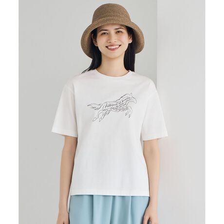 さりげないワンポイントが品よく映える大人のグラフィックTシャツ■デザインシンプルながらも美しく着映えるように仕上げた、大人のためのTシャツです。自由区の定番アイテムとして、全体のバランスにこだわりました。襟ぐりはすっきりときれいに見える開きに設計し、袖丈は腕を程よくカバーするやや長めの半袖に仕上げています。ブランドのパーパスをフランス語で表現し、馬をモチーフにしたグラフィックをあしらいました。シンプルなカラーリングで、大人の女性のスタイリングにさりげない抜け感をプラスする一枚です。■素材天然綿糸を2本撚り合わせ、Tシャツに適した天竺組織に編み立てました。特殊加工を施すことで毛羽立ちを抑え、自然な光沢感を引き出しています。カジュアルになりすぎず、きれい見えする上質な表情が魅力の素材です。
