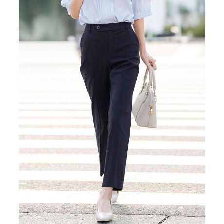 ・オンオフ幅広く活躍するテーパードパンツ・快適なストレッチ性と程よくラフな生地感が特徴・自然なスタイルアップを演出する股上の深さと美脚見えが狙えるシルエットが魅力・ベルト無しでもサマになるボタンデザイン・センタープレスがきちんと感を演出し綺麗め通勤スタイルにもマッチ