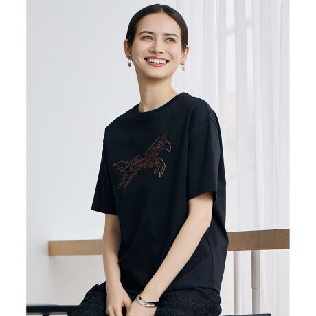 さりげないワンポイントが品よく映える大人のグラフィックTシャツ■デザインシンプルながらも美しく着映えるように仕上げた、大人のためのTシャツです。自由区の定番アイテムとして、全体のバランスにこだわりました。襟ぐりはすっきりときれいに見える開きに設計し、袖丈は腕を程よくカバーするやや長めの半袖に仕上げています。ブランドのパーパスをフランス語で表現し、馬をモチーフにしたグラフィックをあしらいました。シンプルなカラーリングで、大人の女性のスタイリングにさりげない抜け感をプラスする一枚です。■素材天然綿糸を2本撚り合わせ、Tシャツに適した天竺組織に編み立てました。特殊加工を施すことで毛羽立ちを抑え、自然な光沢感を引き出しています。カジュアルになりすぎず、きれい見えする上質な表情が魅力の素材です。
