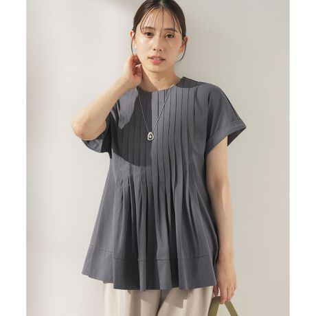 ■デザイン・昨年好評だった、タックワンピースをチュニック丈に落とし込んだ1枚。・幅広のタックでAラインのフレアシルエットをだしたエレガントな印象のチュニック丈のプルオーバーです。・リターンカフスがポイントのドロップスリーブの半袖は二の腕が気になりにくいデザインです。