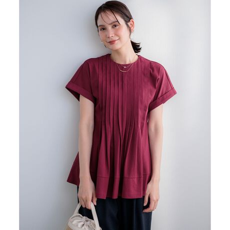 ■デザイン・昨年好評だった、タックワンピースをチュニック丈に落とし込んだ1枚。・幅広のタックでAラインのフレアシルエットをだしたエレガントな印象のチュニック丈のプルオーバーです。・リターンカフスがポイントのドロップスリーブの半袖は二の腕が気になりにくいデザインです。