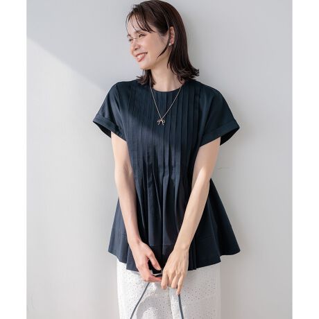 ■デザイン・昨年好評だった、タックワンピースをチュニック丈に落とし込んだ1枚。・幅広のタックでAラインのフレアシルエットをだしたエレガントな印象のチュニック丈のプルオーバーです。・リターンカフスがポイントのドロップスリーブの半袖は二の腕が気になりにくいデザインです。