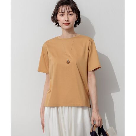 程よい透け感が魅力の天竺素材を使用したTシャツ。大きすぎず、かつ身体のラインを拾いすぎない絶妙なサイジングにこだわりました。襟ぐりを身頃と同じ生地で仕立てることで、Tシャツながらもきれいめな印象で、ジャケットやニットカーディガンのインナーとしてももたつかず、快適かつ上品に合わせていただけます。 一枚着はもちろん、ロゴTシャツとのレイヤードスタイルもおすすめ。カラーは、清潔感のあるホワイト(#001)、シックで万能なブラック(#005)、ニュアンス感のあるキャメル(#034)、爽やかなアクセントになるスカイブルー(#072)の4色展開です。