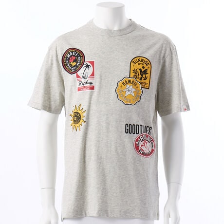 [型番:M304023814N]メランジのコットンジャージークルーネックTシャツ。前面にハワイアンテイストのパッチプリントが配置されていることが特徴で、左袖にアーカイブロゴラベルが取り付けられます。リラックスフィット