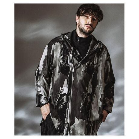 このフードコートは、2026年春夏の NO ID. コレクションにおいて、ライダース要素と軽量ロングコートの構造を融合し、動きとシルエットの変化を楽しめる象徴的な一着です。