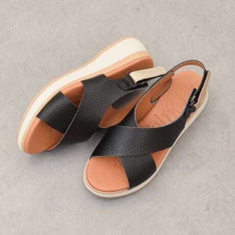 軽いソールとクッションインソールが特徴的なクロスベルトウエッジサンダルは、シンプルなデザインで使い勝手の良いアイテムです。