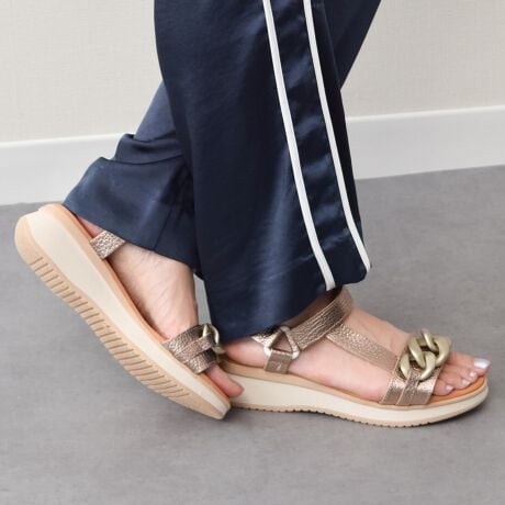 メタルチェーンが特徴的なベルクロサンダルは、クッションインソール仕様でソフトな足当たりです。