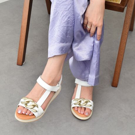 メタルチェーンが特徴的なベルクロサンダルは、クッションインソール仕様でソフトな足当たりです。