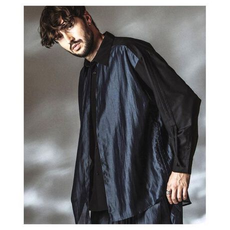 前後身頃にシアー生地を重ねたレイヤード構造により、奥行きのある透け感を表現したデザインシャツ。