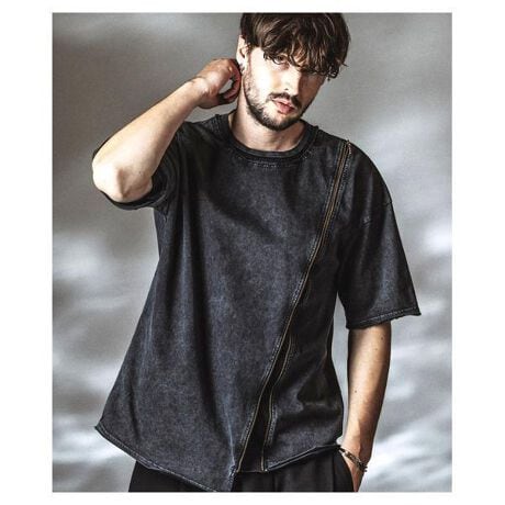 大胆に走らせたロングZIPと重ね着風のレイヤード構造を組み合わせ、視覚的インパクトと可変性を備えたBIGシルエットTシャツ。