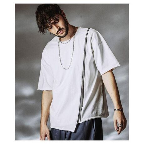 大胆に走らせたロングZIPと重ね着風のレイヤード構造を組み合わせ、視覚的インパクトと可変性を備えたBIGシルエットTシャツ。