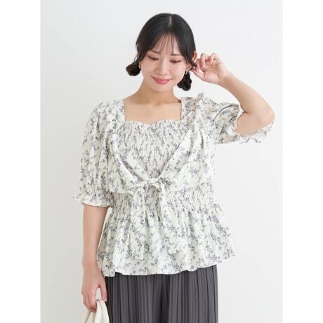 リボン使いのデザインと柄のデザインがアクセントになるので、シンプルなボトムスと合わせていただくのがオススメ♪
