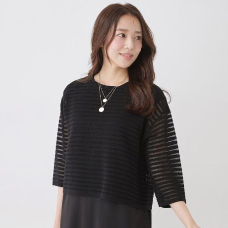 メッシュ調の透かしボーダー柄ニットトップス。
