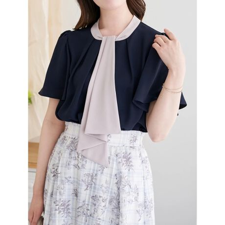配色切り替え半袖ボウタイブラウス