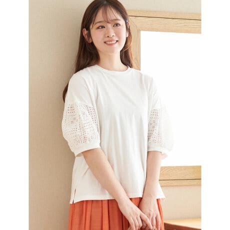 [型番:26410712085]ほんのりと透けるシフリー刺しゅうの袖切り替えが大人可愛いブラウス。ボディ部分をベーシックなデザインに仕上げることで、甘さを抑えた上品な印象に。サイドはスリット入りでスタイリングを軽やかに魅せ、カジュアルなデイリースタイルから、セミフォーマルな通勤スタイルまでマルチに活躍できるアイテムです。Hare no hi/ハレノヒ