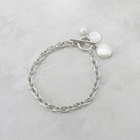 上品な輝きが手元を彩る、フェイクパール付きチェーンブレスレット
