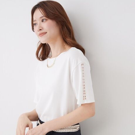 編地をクロスさせた特徴的な編み柄は、初夏の気分を感じられつつ、チラリ覗く透かし穴が女性らしいニュアンスです。