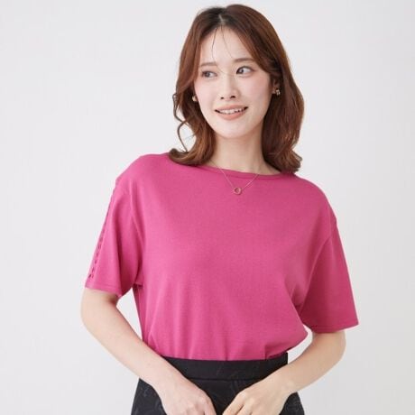 編地をクロスさせた特徴的な編み柄は、初夏の気分を感じられつつ、チラリ覗く透かし穴が女性らしいニュアンスです。