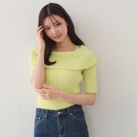 デコルテを美しく見せる「オフショル風ワイドカラー」デザインニット