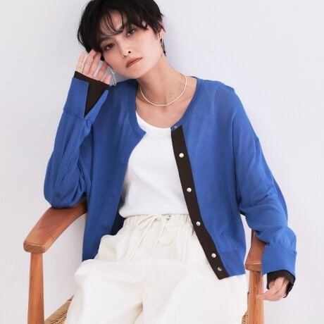 ・前立てや袖口の配色使いをポイントにしたラウンドカラーのニットカーディガン。