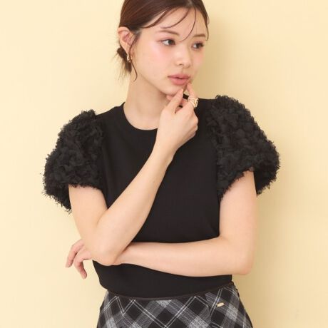 ・袖部分に施された毛足のあるシャギーレースが、奥行きのある華やかさを演出。