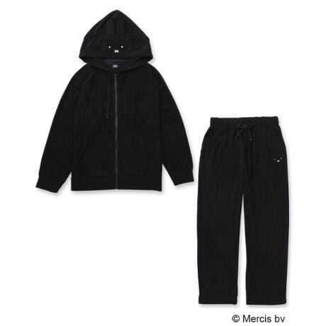 ミッフィーのお顔の刺繍を施したジップアップフーディとパンツのセットアップ。