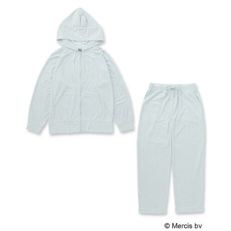 ミッフィーのお顔の刺繍を施したジップアップフーディとパンツのセットアップ。