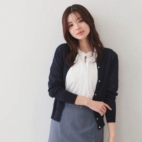 ・着まわしやすいベーシックなコンパクトクルーネックカーディガン。