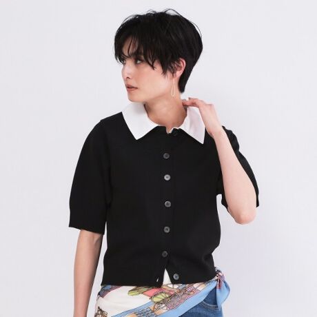 ・シャツ衿をドッキングさせた1枚でコーディネイトを引き立てるデザインポロニット