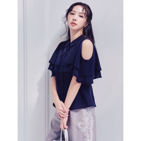 細幅のテープレースをあしらい女性らしい可憐なデザインに仕上げました。肩を程よく開けることで肌見せを上品に抑え、夏らしい涼やかな着心地が叶います。
