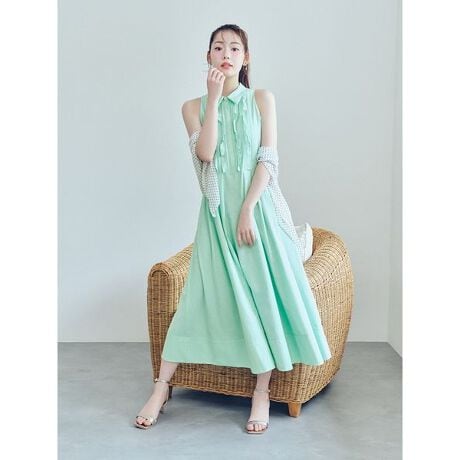 ダンガリー調のシャツ地を使用した襟付きワンピースは、フロントにフレアフリルとピンタックを施すことでカジュアルさの中にも上品な佇まいを演出。