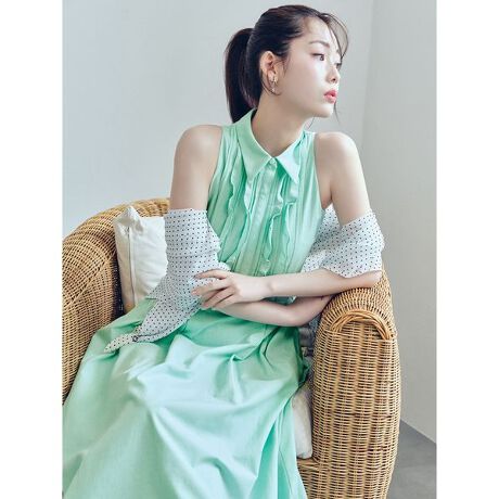 ダンガリー調のシャツ地を使用した襟付きワンピースは、フロントにフレアフリルとピンタックを施すことでカジュアルさの中にも上品な佇まいを演出。