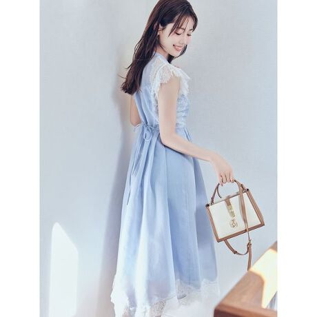 シフォンオーガンジーにストライプ柄がさりげなく入った素材とレーストリムを掛け合わせたワンピース。