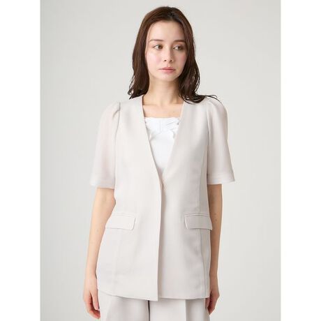 ノーカラーにすることで首元はすっきりさせ、女性らしいふんわりとした袖もポイントです。ポケットには太めのフラップを付けることでアクセントに。あえて裏地はつけずに通気性と軽やかさを追求しました。ウエストはややくびれさせることで自然なスタイルアップが叶います。