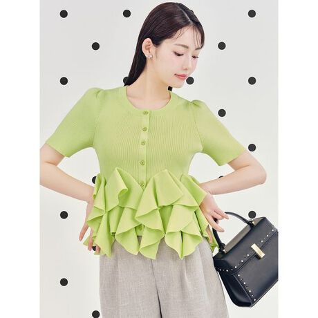 ラッフルフリルデザインの半袖ニットカーディガン。身頃は細リブで伸縮があり、ややカジュアルな雰囲気に。