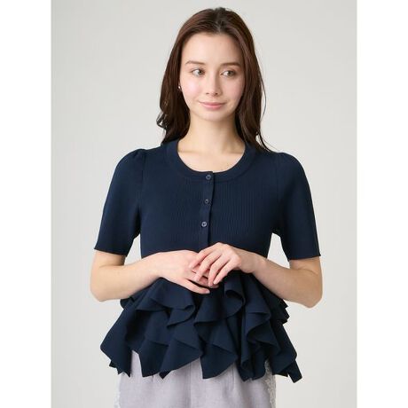 ラッフルフリルデザインの半袖ニットカーディガン。身頃は細リブで伸縮があり、ややカジュアルな雰囲気に。
