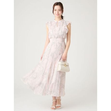 上身頃はタックプリーツを入れ、スタンドカラーで上品な雰囲気に。二の腕をカバーする柔らかなフレアの袖が可憐な印象を与えます。